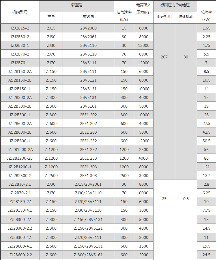JZJ2B系列罗茨--水环真空机组技术规格: